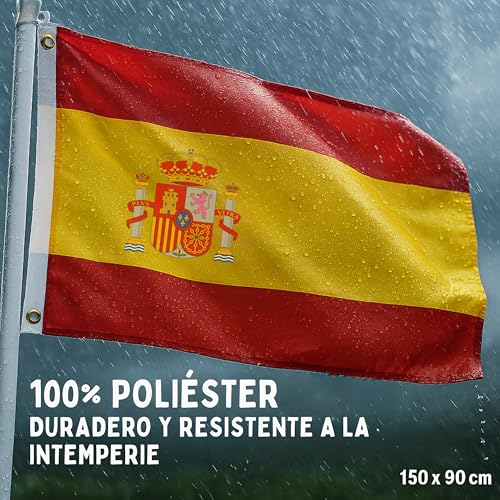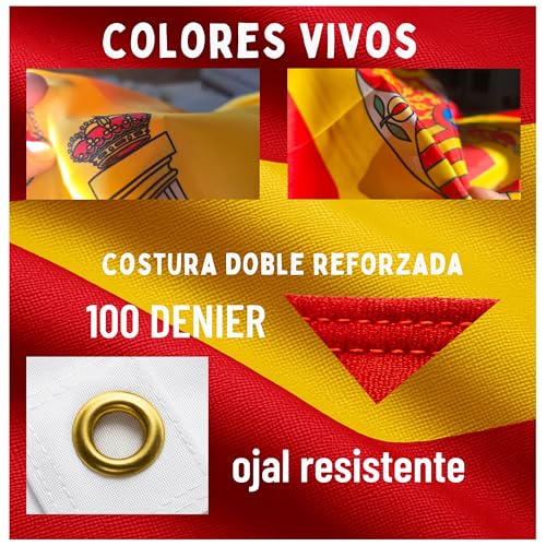 - مواد عالية الجودة وتصميم متين. علمنا الإسباني (90 × 150 سم) مصنوع من البوليستر المتين، وهو مقاوم للطقس ومتين. توفر الدرزات المعززة متانة إضافية، وتبقى الألوان الزاهية سليمة حتى أثناء الاستخدام المكثف. مثالية للاستخدام الداخلي والخارجي.