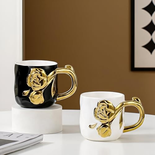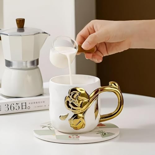 Generic - مج شاي لامع من السيراميك بتصميم وردة ذهبية مناسب لمحبي الشاي وعشاق القهوة على حد سواء، سهل التنظيف وامن في غسالة الصحون والميكروويف، أبيض