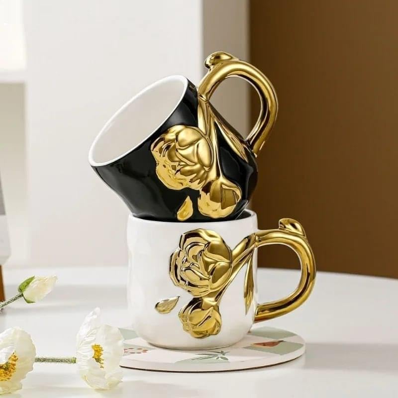 - ميزة التصميم المذهلة هي الوردة الذهبية ثلاثية الأبعاد اللافتة للنظر على المج، يكملها مقبض ذهبي ثلاثي الأبعاد مطابق وسطح سيراميك لامع يلتقط الضوء من كل زاوية.