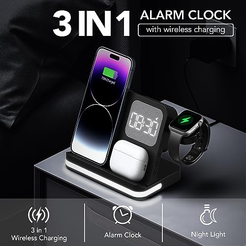 SPGUARD - قاعدة شحن لاسلكية 4 في 1، مزودة بساعة منبه، من اس بي جارد، متوافقة مع موبايل آيفون 15/14/13/12/11، شاحن لاسلكي لساعة آبل 8/7/SE/6/5/4/3/2، وسماعات ايربودز (أسود)