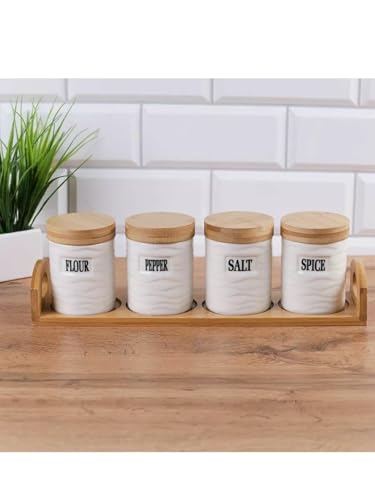 - تحتوي المجموعة على أربعة برطمانات بورسلين مصنوعة بشكل جميل مع حامل خشبي، مما يوفر مظهرًا متناسقًا يعزز ديكور مطبخك ويبسط الوصول إلى التوابل أثناء الطهي.