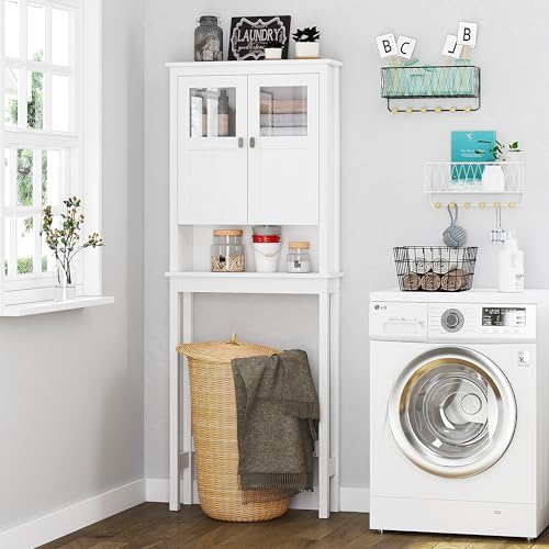 Spirich - دولاب حمام منزلي فوق التواليت من سبيريتش تخزين للحمام مع أبواب ورفوف قابلة للتعديل أبيض زجاج مقوى الخشب