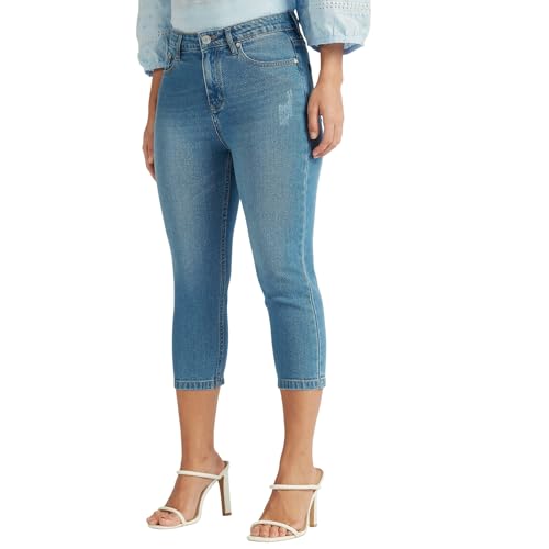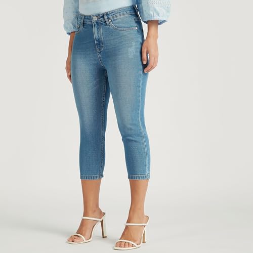 Splash - سبلاش بنطلون جينز كابري سادة متوسط الارتفاع بجيوب وتفاصيل ممزقة بلون ازرق - مقاس 8 6292374604227