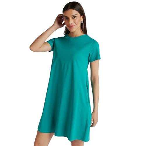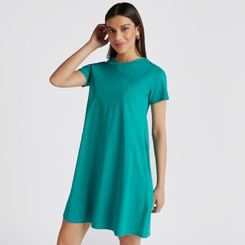 Splash - سبلاش فستان قصير سادة باكمام قصيرة وجيوب بلون اخضر - مقاس 10 6292374938469