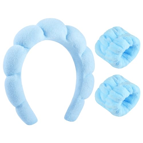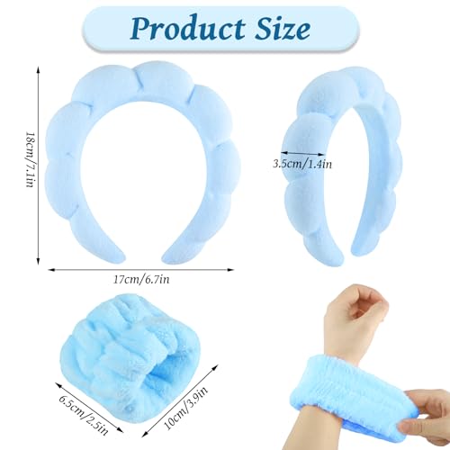 Pimoys - أربطة للرأس إسفنجية للنساء، طقم طوق رأس للمكياج وغسل الوجه والاستحمام وإزالة المكياج والعناية بالبشرة وسوار معصم للغسيل، لون أزرق