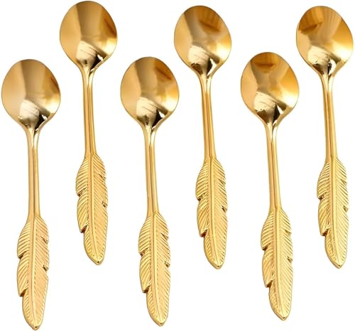 Generic - ملعقة بمقبض بتصميم ريشة ذهبية أنيقة، طقم أدوات تناول طعام مصنوع من الفولاذ المقاوم للصدأ للحلويات والقهوة والشاي والآيس كريم والكيك والتوابل، 6 قطع