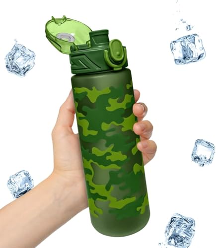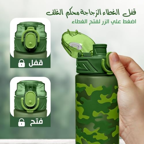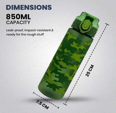 - التصميم: زجاجة مياه أنيقة بنمط مموه بسعة 850 مل، تتميز بغطاء مانع للتسرب وهيكل متين مثالي للأنشطة الخارجية
