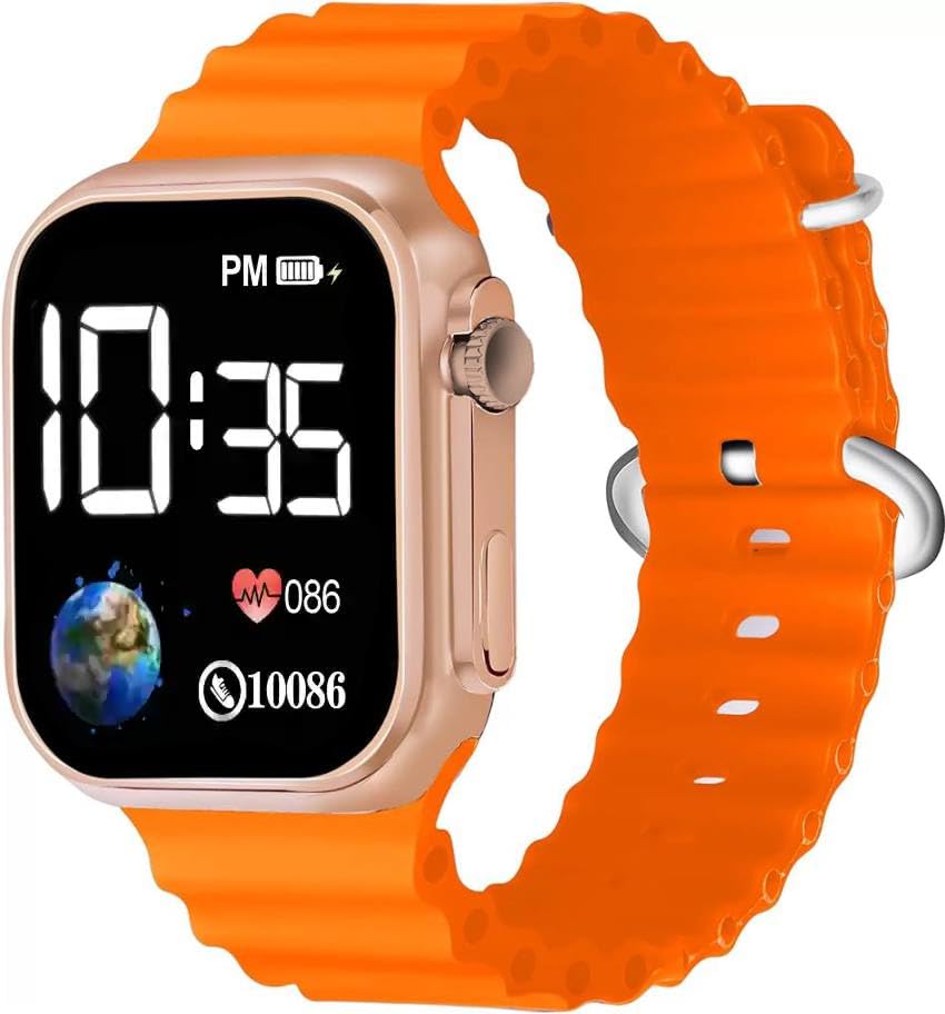 Generic - ساعة ذكية رياضية مع شاشة رقمية، حزام سيليكون برتقالي، إطار ذهبي وردي