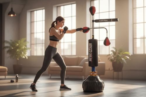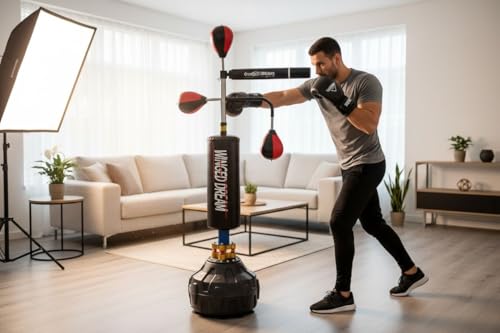 - 2️⃣ تحسين السرعة وردة الفعل والتركيز مزود بكرة سرعة وذراع دوار بزاوية 360° لتطوير سرعة الضرب ودقة الحركة والتنسيق بين اليد والعين. يساعدك على تحسين رد الفعل والتركيز بشكل كبير، مما يجعله مناسبًا لتدريبات الملاكمة واللياقة البدنية والدفاع عن النفس.