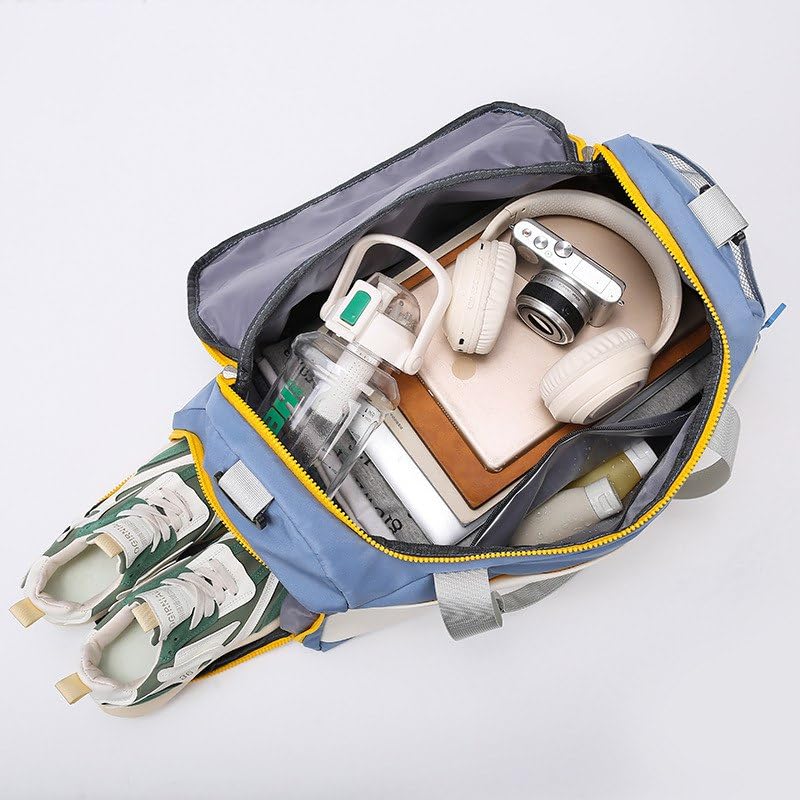 - جيوب منظمة ومنفصلة: مزودة بجيب مخصص للأحذية وجيب منفصل للملابس المبللة أو المناشف، مما يحافظ على نظافة وترتيب أغراضك الشخصية
