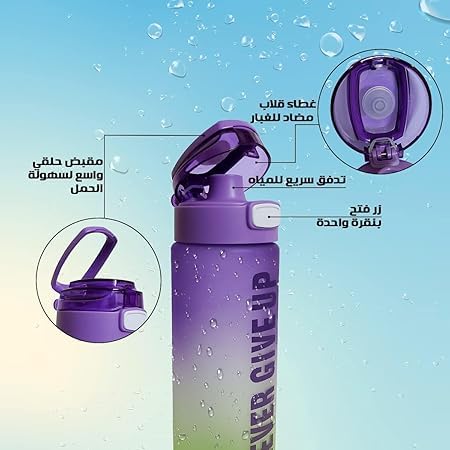 - زجاجة مياه مطبوعة بعبارات تحفيزية مع مؤشر للوقت: تتميز هذه الزجاجة للأولاد بعبارات ملهمة ومميزة وعلامات زمنية كتذكير رائع للحفاظ على رطوبة جسمك وشرب كمية كافية من الماء طوال اليوم. استخدامها مثالي للتحكم في الجوع وإعادة الترطيب بعد التمرين والصحة العامة. زجاجة مياه مقاومة للتسرب والغبار: يتميز الغطاء العلوي القابل للطي بقفل محكم وبتصميم مقاوم للتسرب والغبار. ما عليك سوى الضغط على الزر لفتحها بيد واحدة. يحتوي غطاء الزجاجة على حلقة إغلاق من السيليكون وقفل موثوق. لن يتسرب السائل من زجاجة المياه التتبعية المدرسية للأطفال أبدًا حتى عند الدوران.