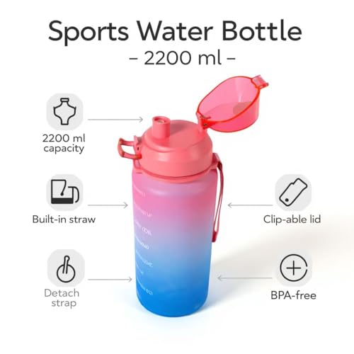 - سعة كبيرة جدًا 2.2 لتر - حافظ على رطوبتك بالكامل طوال اليوم مع زجاجة المياه الرياضية كبيرة الحجم، مثالية للجيم أو المكتب أو السفر أو المغامرات الخارجية.
