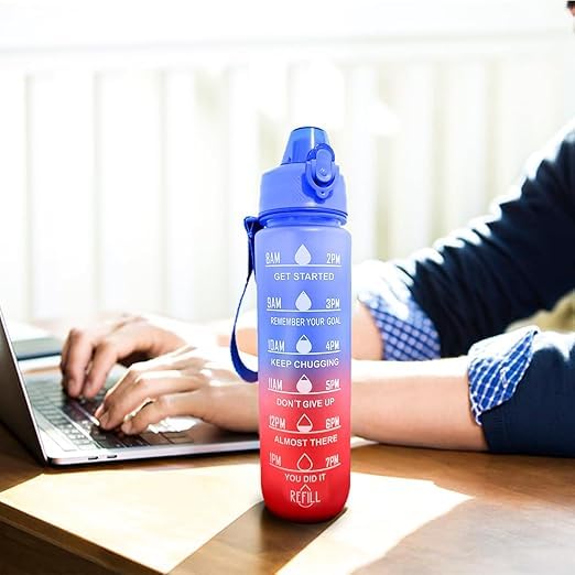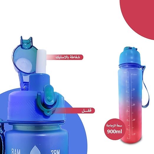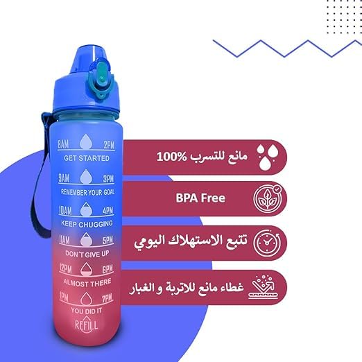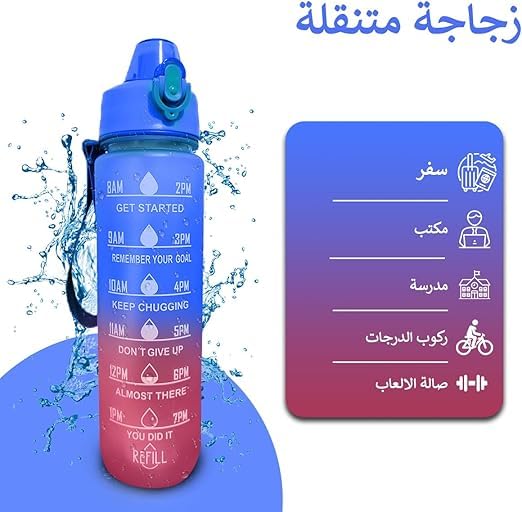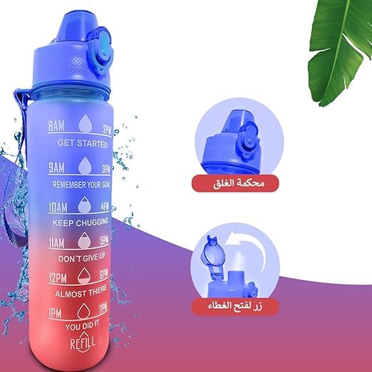 - حافظ على رطوبتك أثناء التنقل: تم تصميم زجاجة المياه الرياضية سعة 1 لتر هذه للحفاظ على رطوبة جسمك أثناء كل مغامراتك، سواء كنت مسافرًا أو تمارس التمارين الرياضية في صالة الألعاب الرياضية أو أثناء المشي لمسافات طويلة أو ببساطة ليومك بشكل عام.