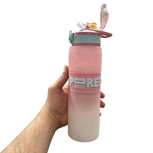 - ١) تصميم عصري: زجاجة مياه رياضية بتدرج لوني جميل من الوردي إلى الأبيض، مع شعار PRET البارز