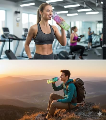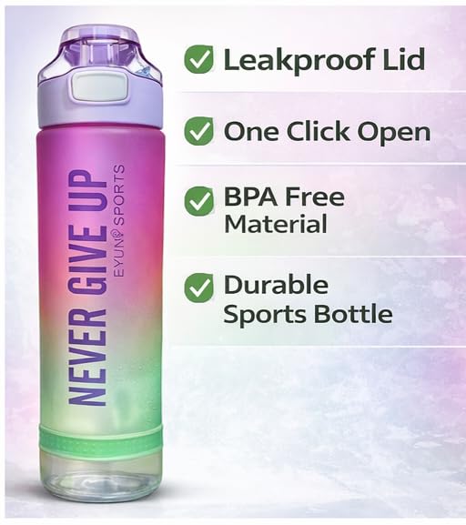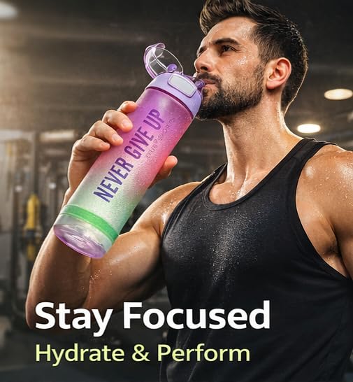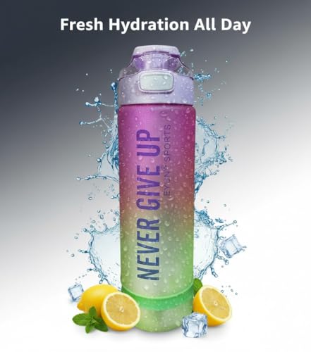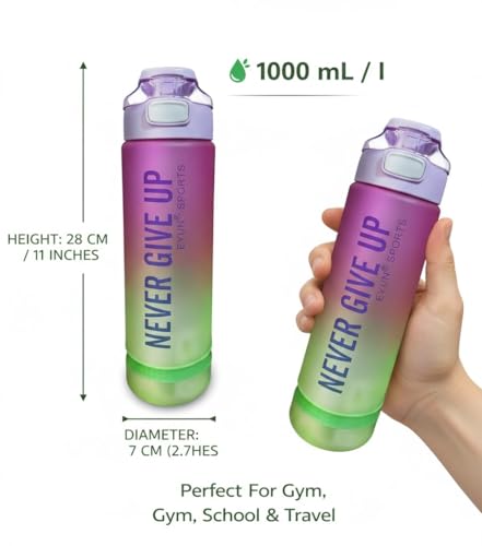 - [تحفيزية وأنيقة]: يتميز بشعار "NEVER GIVE UP" الملهم وتصميم ألوان متدرجة نابضة بالحياة. تم تصميم هذه الزجاجة سعة 1 لتر للحفاظ على تحفيزك وترطيبك طوال أصعب التدريبات أو أيام العمل الطويلة.