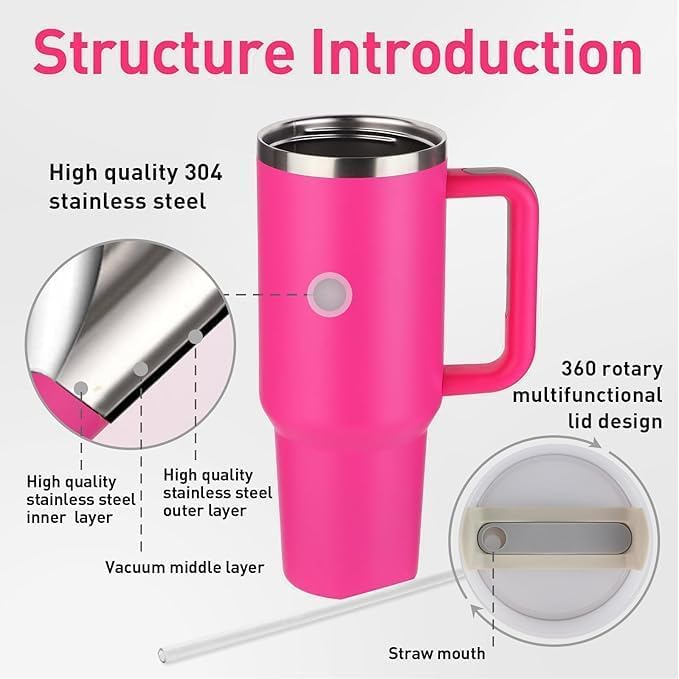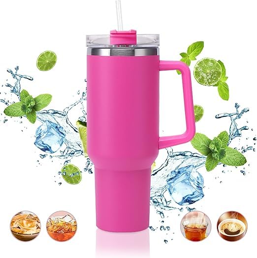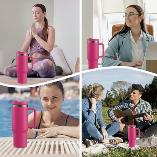 SPORTSZONE - كوب حراري (تمبلر) بسعة 1200 مل، مصنوع من الفولاذ المقاوم للصدأ ومعزول بالتفريغ الهوائي، مزود بمقبض وغطاء ومصاصة، كوب سفر كبير للمشروبات الساخنة والباردة من سبورتس زون، لون أحمر وردي