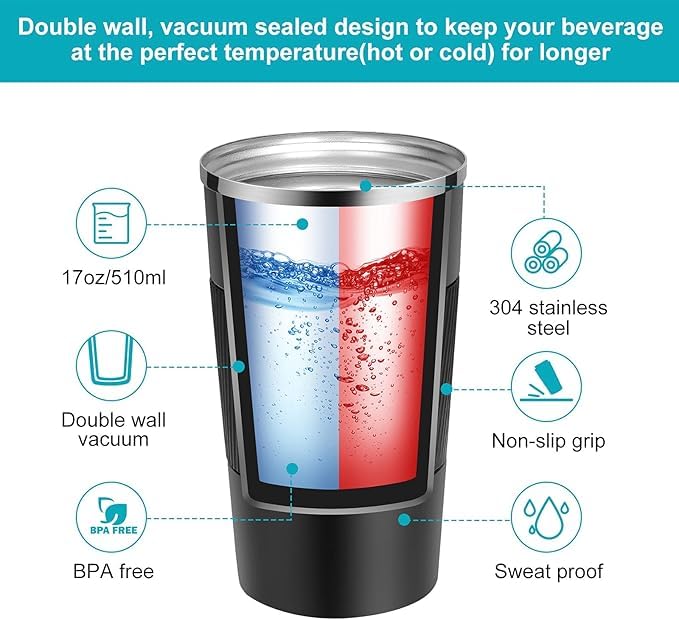 - تقنية العزل الحراري - تحافظ على مشروباتك باردة لمدة 24 ساعة أو ساخنة لمدة 12 ساعة، مثالية للترطيب طوال اليوم.