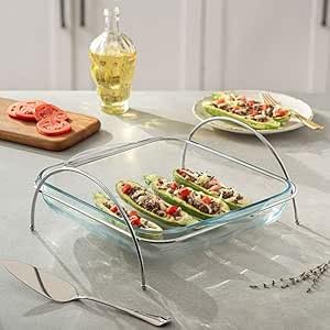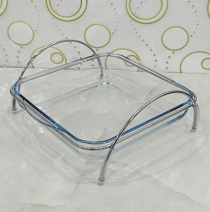 Generic - طبق كسرولة زجاجي مربع مع حامل معدني، آمن للاستخدام في الفرن والميكروويف، نمط تركي