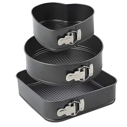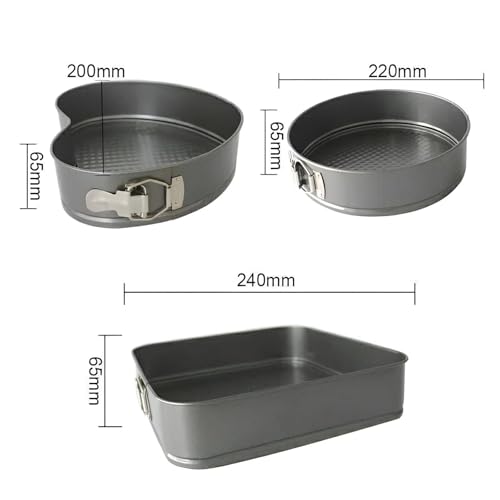 - تتضمن هذه المجموعة ثلاثة قوالب غير لاصقة ومضادة للتسرب مصممة خصيصًا لخبز الكيك، وتتميز بقاعدة قابلة للإزالة لسهولة إخراج الكيك. تأتي القوالب بثلاثة أشكال مميزة: مربعة، ودائرية، وقلبية، لتلبية احتياجات الخبز والمناسبات المختلفة.