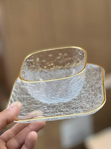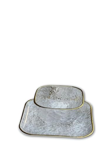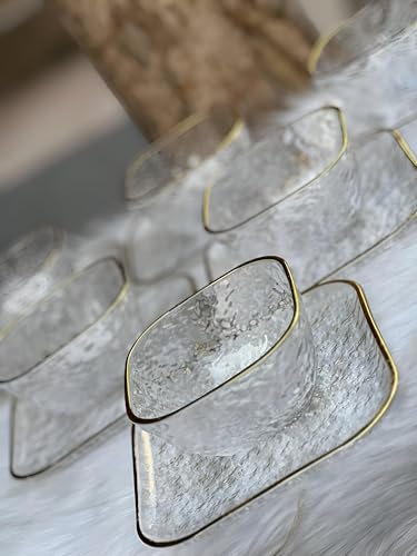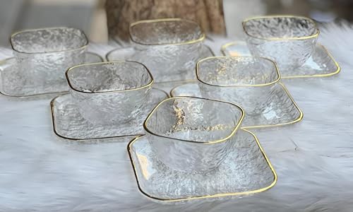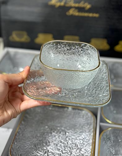 Generic - طقم أواني تقديم الطعام مربعة - 12 قطعة من أطباق وبولات زجاجية مزخرفة بحواف ذهبية أنيقة، مناسبة للحلويات والمقبلات