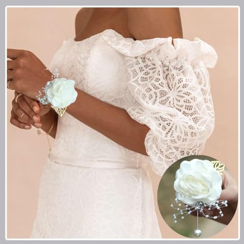 - مظهر طبيعي وواقعي: تضيف الدبابيس اليدوية النابضة بالحياة وبتلات الورد على المعصم الجمال والأناقة إلى حفل زفافك، مزيج بسيط من الزهور البيضاء التي يمكن دمجها بسهولة مع الفساتين وإضافة لمسة من الأناقة إلى فستانك.