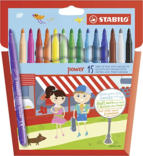 STABILO - قلم جاف بطرف فايبر متوسط من ستابيلو باور، عبوة من 15 قطعة، ألوان متنوعة