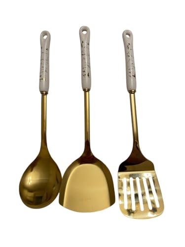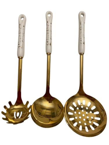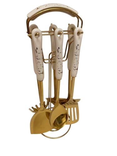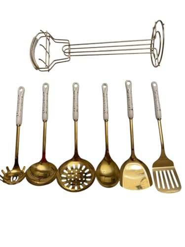Generic - مغارف ستانلس جولد - طقم توزيع عدد 6 مغارف استانلس ستيل ذهبي مع حامل يد ماربل رخامي ابيض