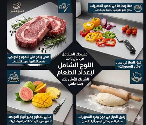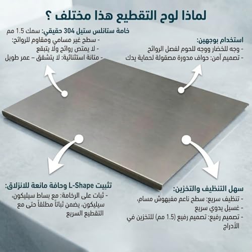 - ️ استثمار صحي مدى الحياة (ستانلس 304): ودع البكتيريا والعفن والروائح الكريهة للأبد. مصنوع من الستانلس ستيل 304 النقي المعتمد للأغذية، بسطح صلب غير مسامي لا يمتص السوائل ولا يتشقق مثل الخشب أو البلاستيك، مما يضمن لك وجبات صحية وآمنة لعائلتك كل يوم.
