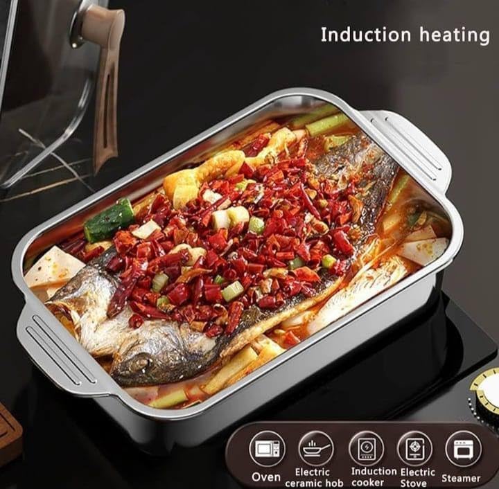 - الفولاذ المقاوم للصدأ عالي الجودة: مصنوعة من الفولاذ مقاوم للصدأ الفاخر، هذه الصينية مقاومة للصدأ ومتينة ومصممة لتدوم طويلًا. على عكس المقالي المغلفة، تظل آمنة وغير تفاعلية وصديقة للبيئة للاستخدام طويل الأمد.