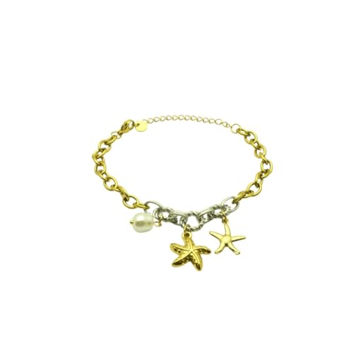 Generic - سوار من الستانلس ستيل ثنائي اللون بدلاية على شكل نجم البحر واللؤلؤ للنساء - ذهبي وفضي
