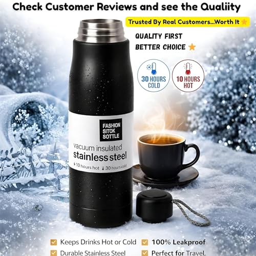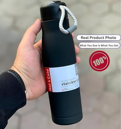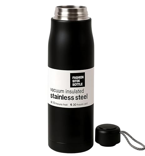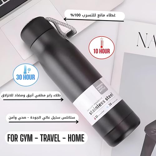 Generic - زجاجة ستانلس ستيل معزولة بتفريغ الهواء سعة 550 مل بلون اسود مات مع غطاء امن وحزام حمل، تحافظ على درجة الحرارة لمدة 30 ساعة باردة و10 ساعات ساخنة، تصميم مانع للتسرب