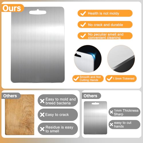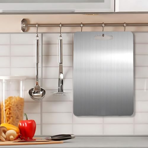 - 【مواد عالية الجودة】- مصنوعة من الفولاذ المقاوم للصدأ 304 بسمك 2 ملم، ألواح التقطيع المصنوعة من التيتانيوم مقاومة للقطع والخدوش، ويمكنها تحمل مهام القطع الشاقة، مما يضمن الاستخدام طويل الأمد دون تشوه. بالمقارنة مع ألواح التقطيع الخشبية أو البامبو التقليدية، فإن ألواح الفولاذ المقاوم للصدأ لن تتراكم المواد الكيميائية أو علامات القطع أو البلاستيك الدقيق