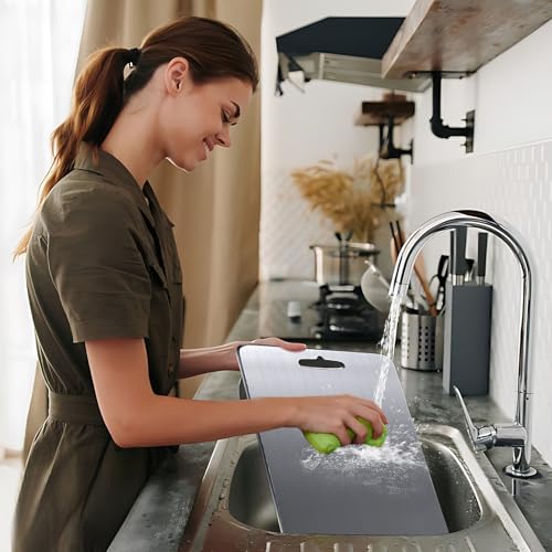 - 【سهل التنظيف】- يتميز لوح التقطيع المصنوع من التيتانيوم بسطح غير مسامي لتجنب بقايا الطعام وهو سهل التنظيف للغاية، ما عليك سوى شطفه بالماء. لا يمتص السوائل والطعام، مما يحافظ على سطح اللوح صحيًا