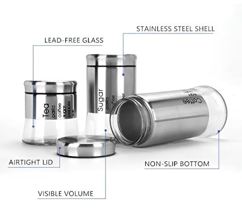 - تضم هذه المجموعة الأنيقة المكونة من 3 قطع أواني زجاجية خالية من الرصاص مع أغطية من الفولاذ المقاوم للصدأ مصقولة، وتقدم متانة فائقة ومظهرًا فاخرًا يعزز أي مطبخ أو مكتب أو مقهى، مع ضمان تخزين آمن وخالٍ من المواد السامة للسلع الجافة مثل القهوة والشاي والسكر والأرز والتوابل.