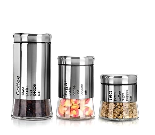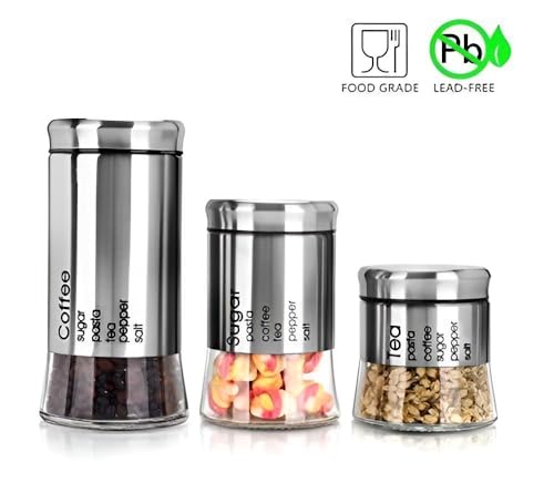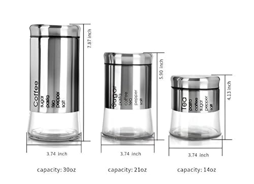Generic - حاويات بأغطية فولاذ مقاوم للصدأ - مجموعة تخزين طعام زجاجية خالية من الرصاص بإغلاق محكم، 3 قطع (30 أونصة و21 أونصة و14 أونصة) للقهوة والشاي والسكر؛ حل أنيق ومتين للمطبخ.