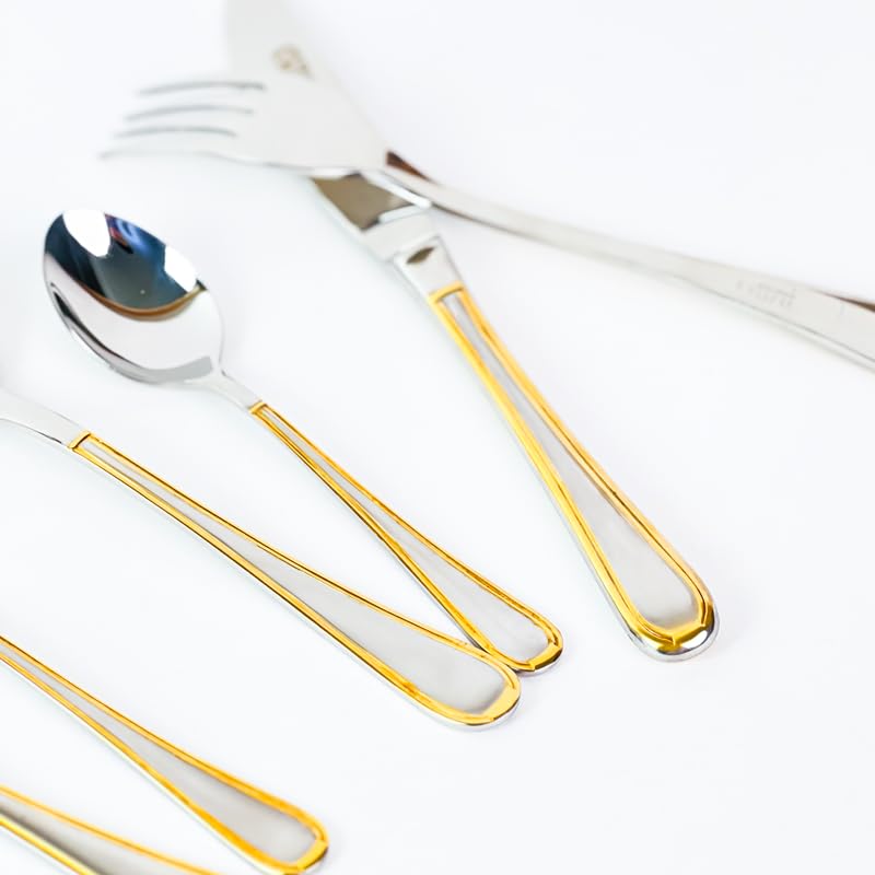 - تصميم أنيق باللون الذهبي: يتميز بلمسة نهائية مصقولة متطورة مع لمسات زخرفية ذهبية فاخرة على طول المقابض، مما يضيف لمسة من الأناقة إلى أي طاولة أو مناسبة لتناول الطعام