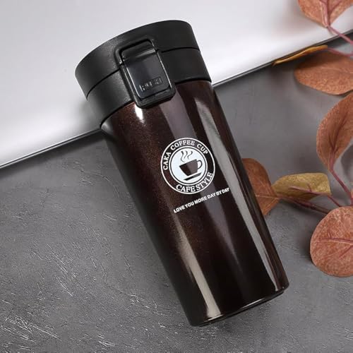 H-Home - مج قهوة للسفر مزدوج الجدار مفرغ ومعزول من الستانلس استيل مع مقبض وكوب حراري محمول، كوب بفتحة واسعة وغطاء مقاوم للتسريب، سعة 380 مل، بلون بني غامق