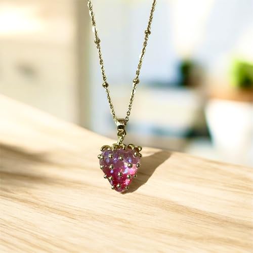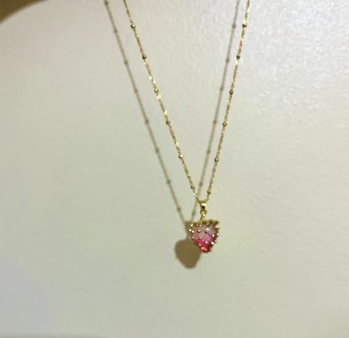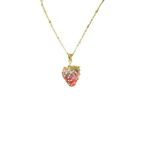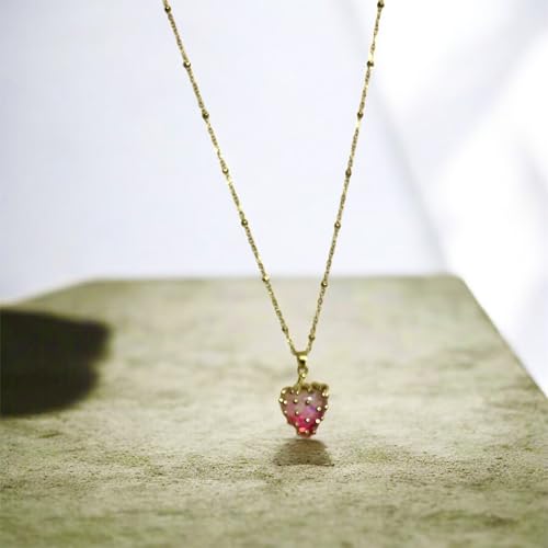 cherry accessories - عقد بقلادة على شكل فراولة ومينا من الستانلس ستيل للنساء - ذهبي واحمر