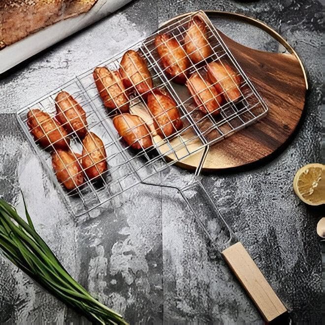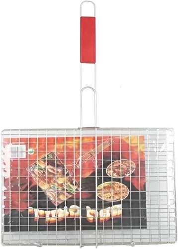 Spaceshoop - سلة شبكية من فولاذ مقاوم للصدأ بمقبض خشبي للأسماك المشوية والخضروات والجمبري والمأكولات البحرية (مقاس كبير) (35 × 25 × 50 مستطيلة) (قطعة واحدة)