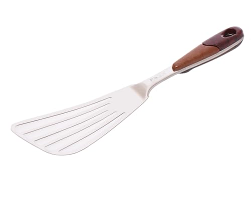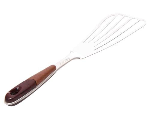 Generic - ملعقة مسطحة مسطحة للاسماك من الستانلس ستيل بمقبض بني، ملعقة تقليب مشقوقة عريضة للطبخ
