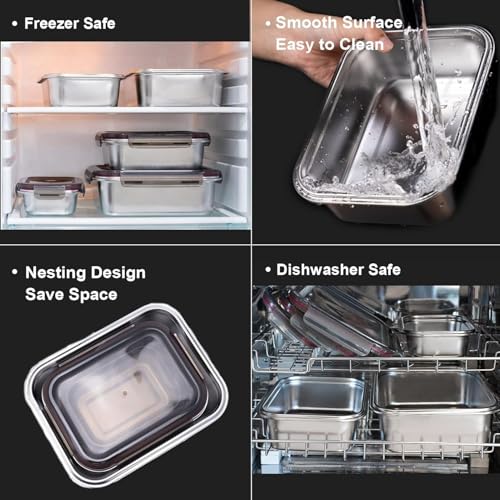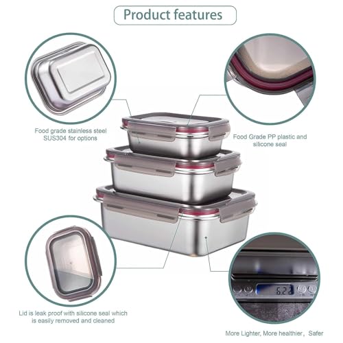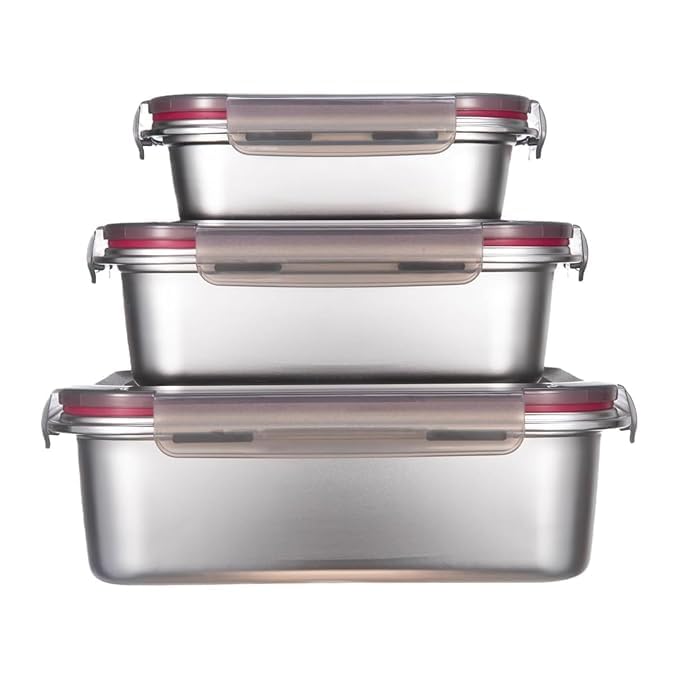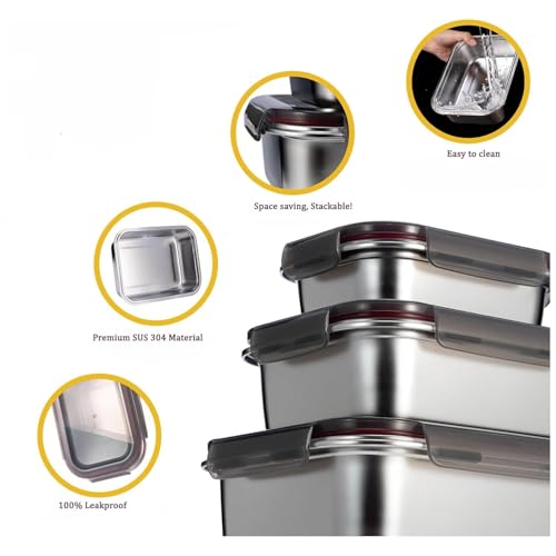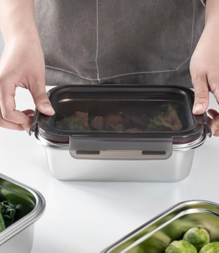 - [خالية من البيسفينول ايه ومتينة] حاويات تخزين الطعام المصنوعة من الستانلس ستيل مصنوعة من الستانلس ستيل 304 الآمن غذائيًا، مما يضمن أنها مقاومة للصدأ والتآكل وقوية وتدوم طويلاً. كن مطمئنًا أنه سيتم تخزين طعامك بأمان دون أي مواد كيميائية ضارة.