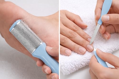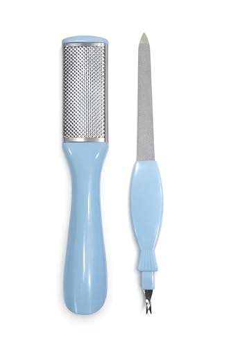 - مجموعة أدوات العناية بالقدم مع مبرد الأظافر، تتضمن هذه المجموعة مبرد قدم من الستانلس ستيل للعناية بمسامير القدم والجلد الخشن، بالإضافة إلى مبرد أظافر لتشكيل وتنعيم الأظافر للحصول على روتين باديكير كامل في المنزل.