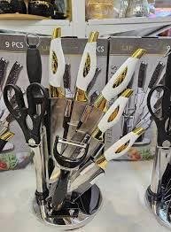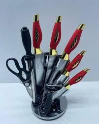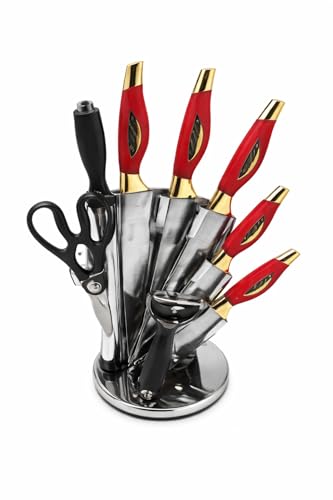 Generic - طقم سكاكين مطبخ من الفولاذ المقاوم للصدأ مع حامل دوار، 9 قطع، مقابض حمراء وذهبية، يتضمن مقص ومبراة (رشاقه سكاكين)