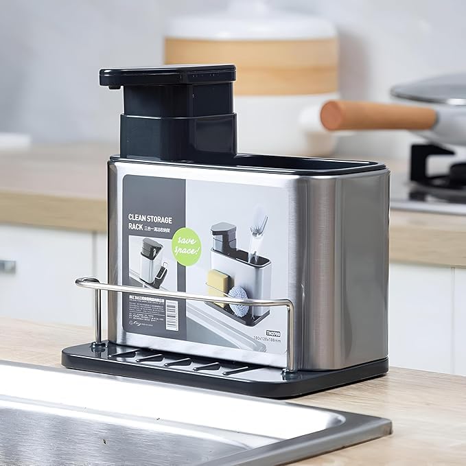 - تصميم متعدد الوظائف 3 في 1: يجمع هذا المنظم بين موزع صابون سائل قابل لإعادة التعبئة، وحجرة تخزين علوية للفرش وأدوات التنظيف، وحامل أمامي مع حاجز حماية للإسفنج وأدوات الغسيل