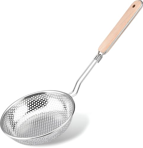Generic - مصفاة مصفاة دقيقة مثقبة من الفولاذ المقاوم للصدأ فعالة للطهي، رائعة لأطباق المعكرونة والشعيرية، مزودة بمقبض خشبي قوي، بحجم مناسب يبلغ 14 سم (1 مصفاه)