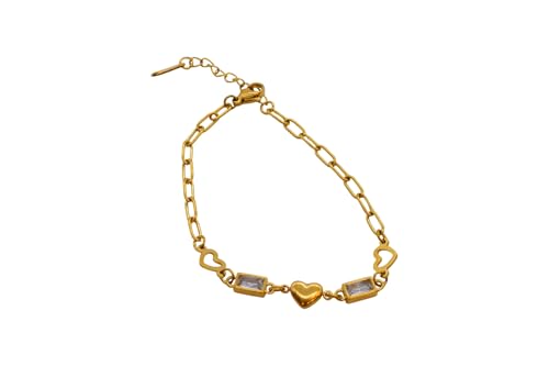 Generic - سوار للنساء من الستانلس ستيل بتصميم مستطيل ومرصع باحجار كريمة على شكل قلب مع مشبك لوبستر، مقاس واحد - ذهبي