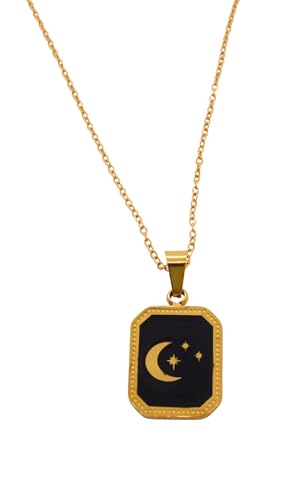 Generic - عقد بقلادة سوداء مستطيلة من الستانلس ستيل بتصميم قمر ونجوم للنساء - ذهبي FA440