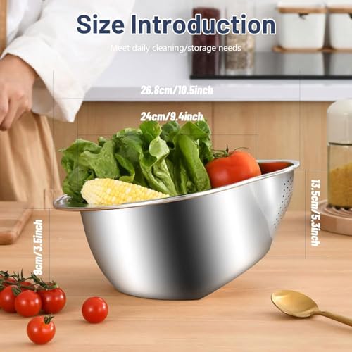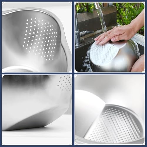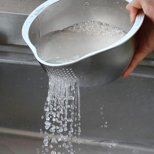 - تصميم فريد: بقطر داخلي 21.6 سم وارتفاع 14 سم، تتميز مصفاة الأرز المصنوعة من الفولاذ المقاوم للصدأ بتصميم قاع مائل فريد ومصارف جانبية لتصريف سريع وكامل. إنها مثالية لغسل الأرز والخضروات والفاكهة.