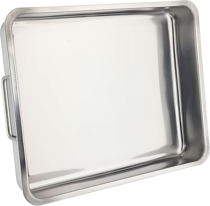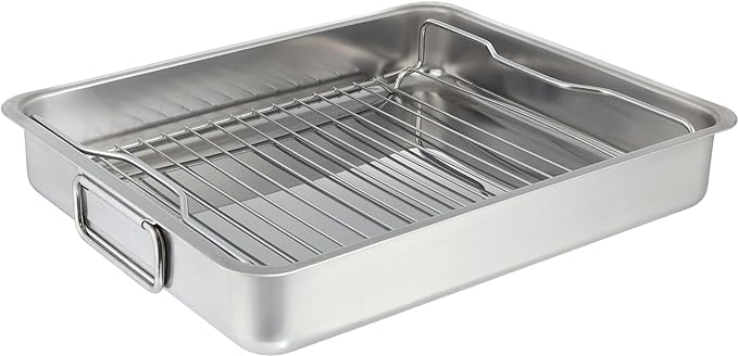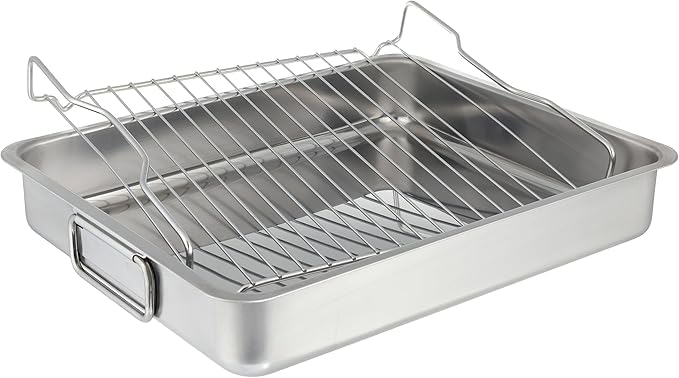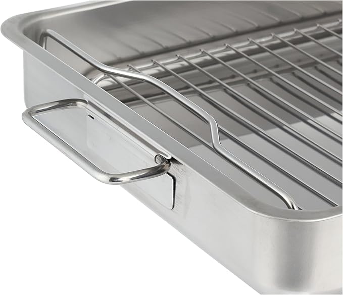 - التصميم: صينية تحميص فاخرة من الفولاذ المقاوم للصدأ بمقابض متينة ورف شواء قابل للإزالة لخيارات طهي متعددة الاستخدامات.