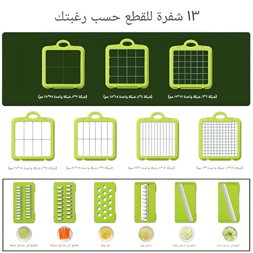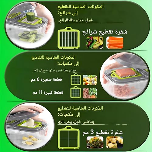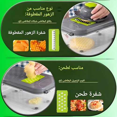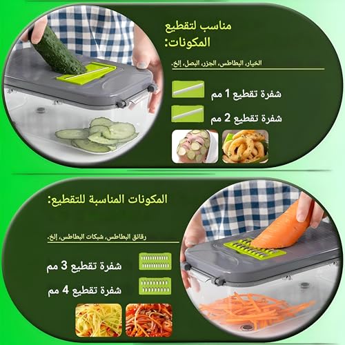 - بفضل تصميمها الصغير، فإن قطاعة شرائح هذه سهلة التخزين ولا تشغل مساحةً كبيرة على الطاولة، مما يجعلها مثاليةً للمطابخ الصغيرة. حيث أن تعدد استخدامات قطاعة الخضروات وقدرتها على تنفيذ 22 مهمة تقطيع مختلفة ستغير تجربة طهيك بالكامل. سواءً لتحضير وجبات لنفسك أو تقديم الطعام لمجموعة كبيرة من الأشخاص، فإن هذه الأداة توفر راحةً وكفاءةً استثنائيةً تتيح لك الاستمتاع بالطهي دون متاعب.